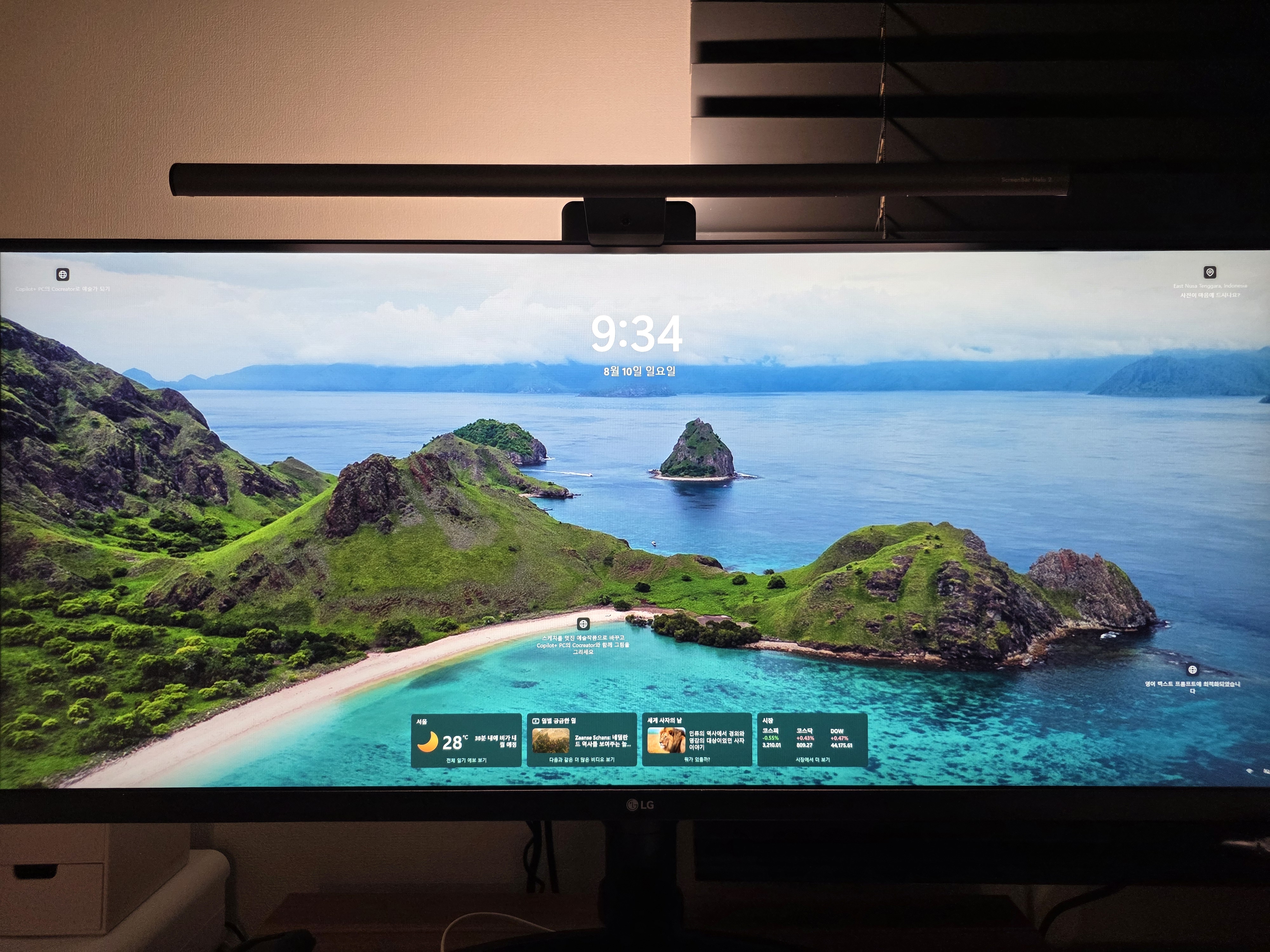 마지막으로 제가 사용 중인 모니터는 LG 34WN750 모델인데 와이드 모니터임에도 벤큐 스크린바 헤일로2를 사용하기에 무리가 없고 안정적인 거치 및 다운조명 범위가 화면 앞쪽으로 빈틈없이 커버해주었습니다.